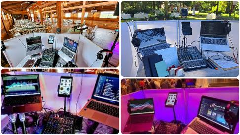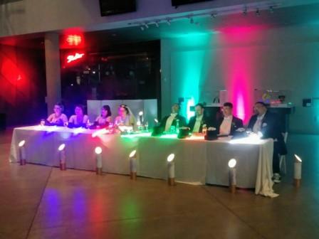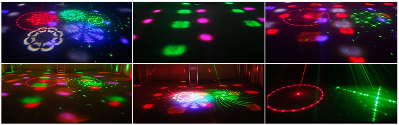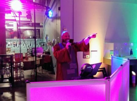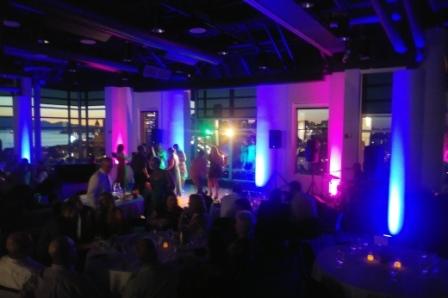 All DJ gigs include the managed use of our dance floor lighting system (whose effects are shown below right), mounted on a Chauvet professional lighting stand. We use offer eight RGB color mixing 36 LED flat par lighting arrays which may be applied in any creative manner, often decorative up lighting for your dining area, dessert or welcome tables. Various lighting systems are used to illuminate the interior of our DJ façade, and use additional lasers too.