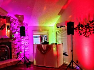 We utilize a DJ facade which may be illuminated, set up and placed in various ways. We usually opt for a four foot table with the sides folded in for an efficient footprint & can flex for a big presence in big spaces.