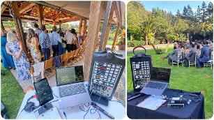 Most DJ's will set one speaker array at the far rear of your ceremony. I set this system at the front and hide the TWO speakers in the garden, hedge, plants, etc. producing a rich beautiful sound from an unknown source. This allows me to perfectly cue your ceremony music from the front if I am officiating OR from the ceremony DJ table virtually anywhere else.