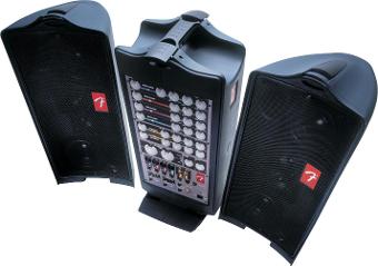 Featured here is our Fender Passport Deluxe PD-250 Portable PA controlled by its own 4 channel 2 line mixer tower with professional after market true 12AWG patch cables I can run up to 100 feet either way. Both the audio and power is transferred to the speakers via these.