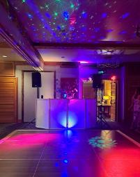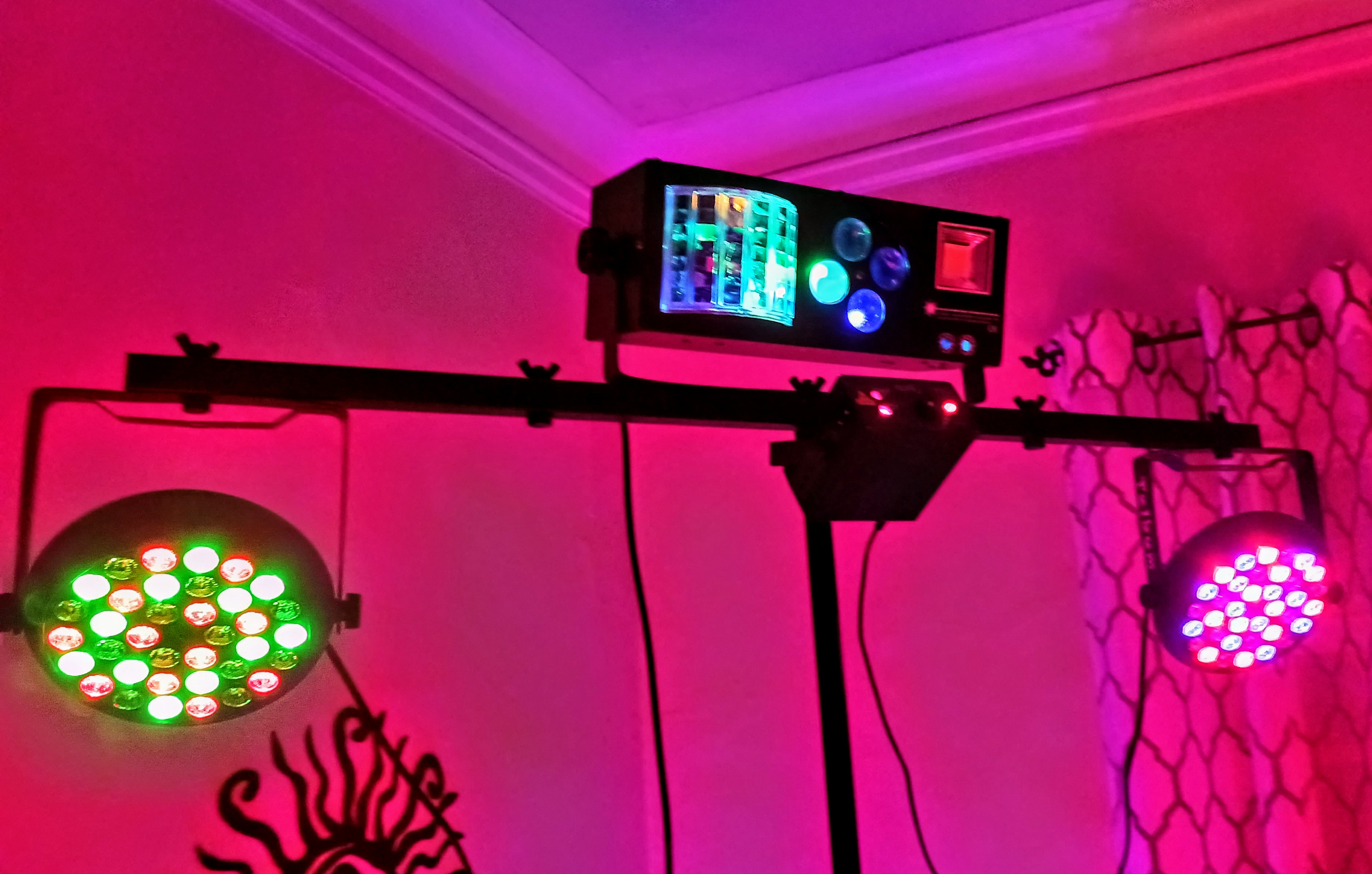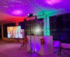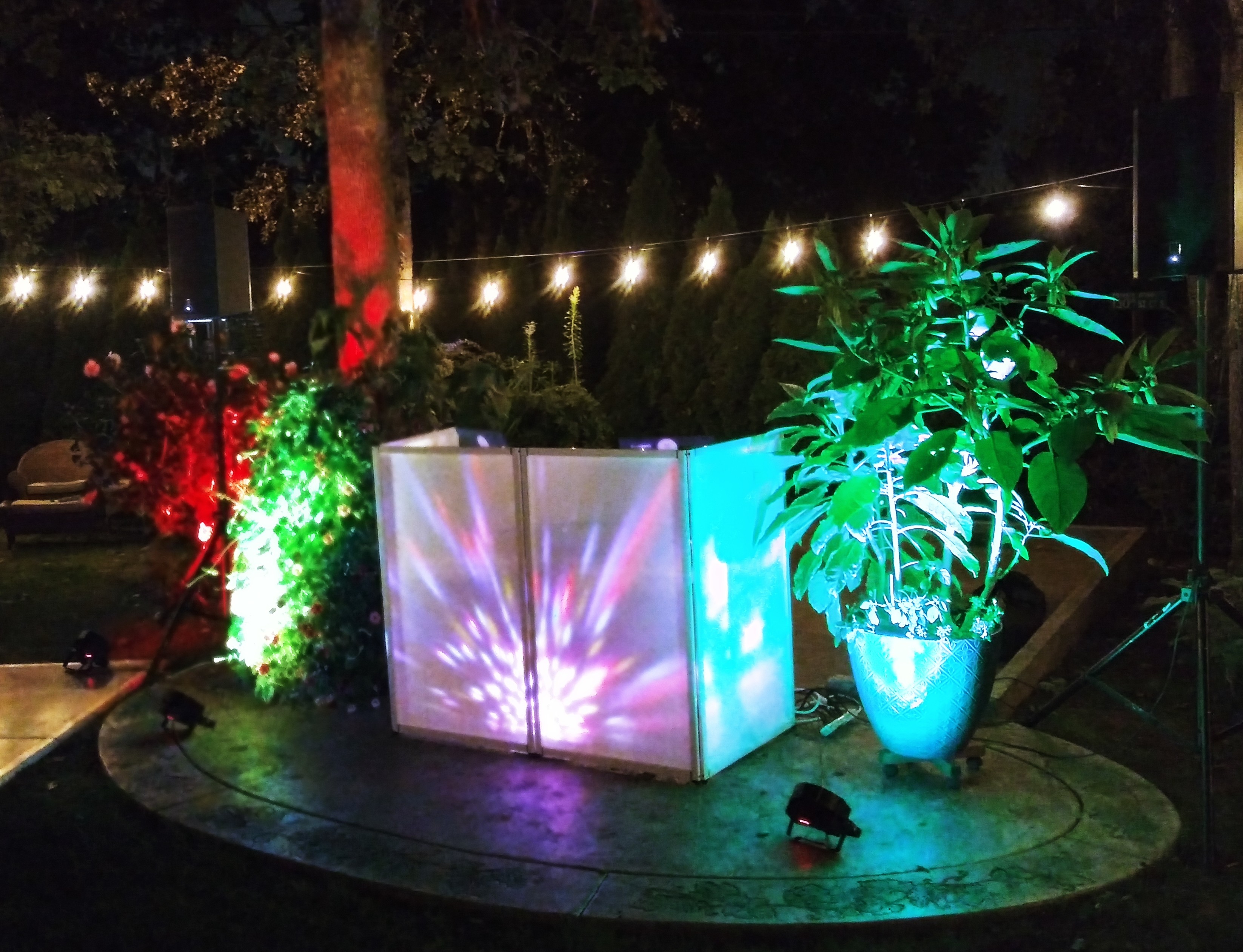 All DJ gigs include the managed use of our dance floor lighting system (whose effects are shown below right), mounted on a Chauvet professional lighting stand. We use offer eight RGB color mixing 36 LED flat par lighting arrays which may be applied in any creative manner, often decorative up lighting for your dining area, dessert or welcome tables. Various lighting systems are used to illuminate the interior of our DJ façade, and use additional lasers too.