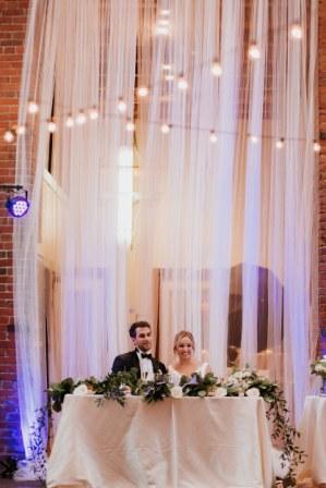 This photo directly above left features our Kebert 45W, RGBW stage and wall wash bar often used behind the buffet, bar, gift or dessert table. It can be a static color or rotating. Above right is our Suny laser lighting unit. I often focus this up onto the interior ceiling of the reception space. It's gorgeous inside elegant reception tents. The darker the space, the greater the impact. White pipe and draping offers the best backdrop for impactful lighting.